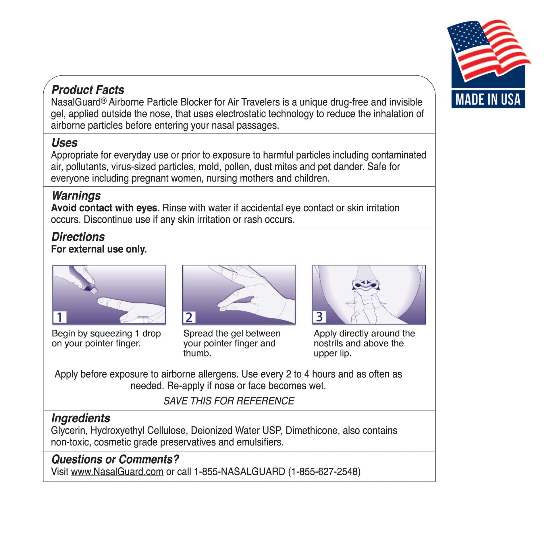 - HECHO EN ESTADOS UNIDOS: NasalGuard para viajeros aéreos se elabora con orgullo y meticulosidad en los Estados Unidos, cumpliendo con los más altos estándares de calidad. Con este gel nasal premium, puedes viajar con confianza, sabiendo que durante tu vuelo tendrás una protección confiable contra los alérgenos, lo que fomenta una experiencia de respiración más cómoda donde sea que vayas.