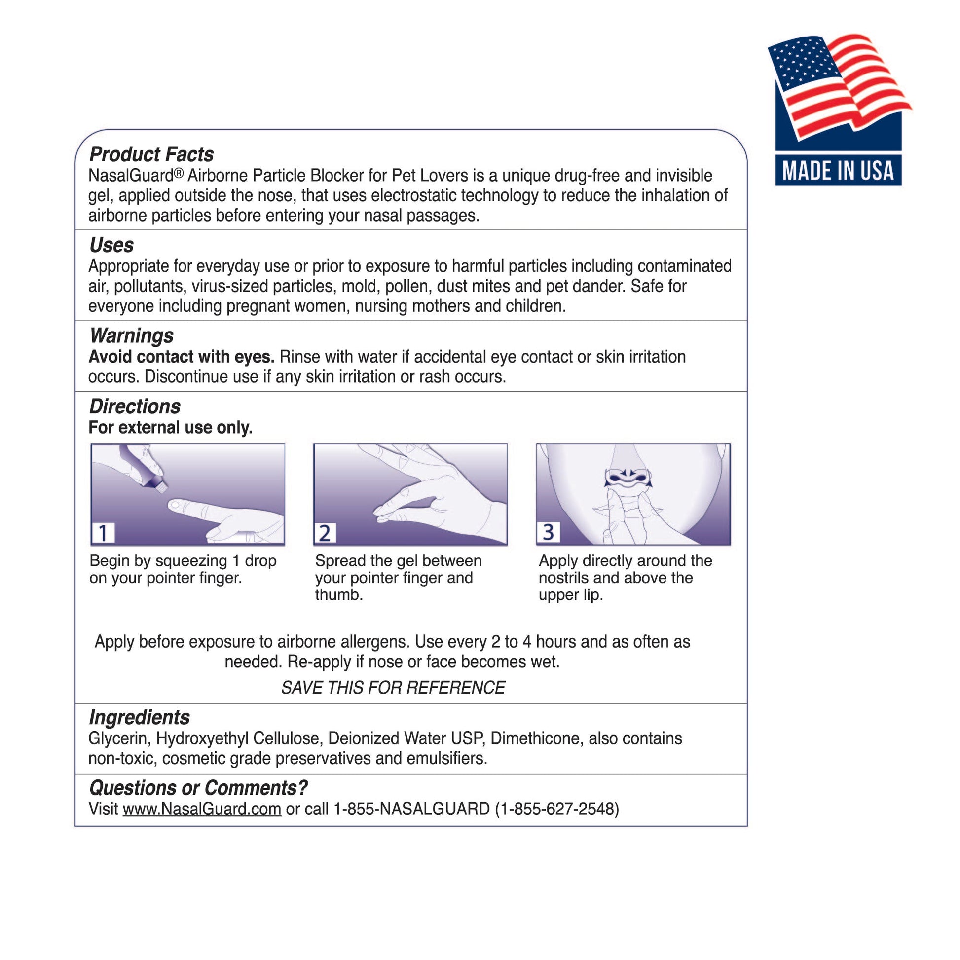 - EL ALIADO DE LOS AMANTES DE LAS MASCOTAS PARA LA PROTECCIÓN CONTRA ALERGIAS: Disfruta el vínculo con tus mascotas mientras mantienes las alergias bajo control con NasalGuard. Este excepcional gel nasal está especialmente diseñado para amantes de las mascotas como tú, ofreciendo una solución suave para combatir las alergias al pelo y la caspa de mascotas. Aplica este innovador gel alrededor de tu nariz y labio superior para experimentar la alegría de convivir con tus mascotas sin preocuparte por las alergias.
